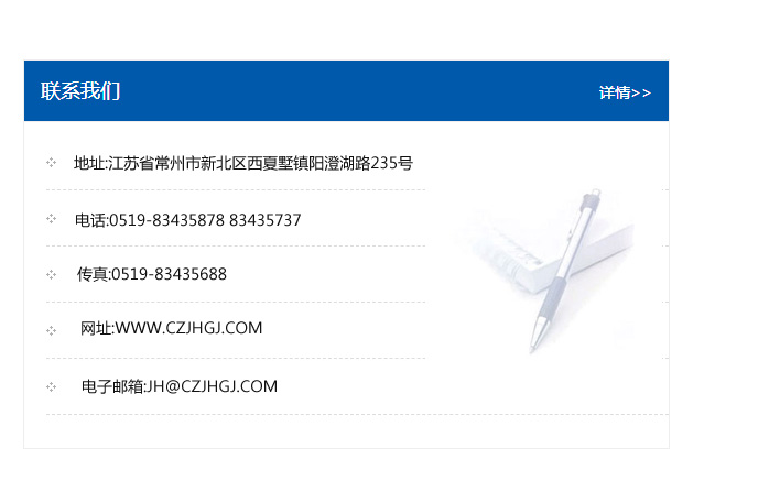 地址:常州市新北區友邦商務大廈1幢16、17層  電話:0519-85101652  傳真:0519-85112595  郵編:213022  網址:www_cz-jiayue_cn.cdbcxy.com  郵箱:xiajifengaa@163.com